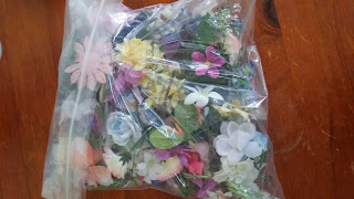 There is a mix of fake flowers that have been cut off their stems, craft flowers and ribbon flowers.