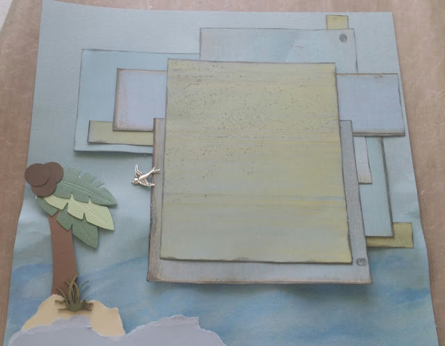 The leaves were my inspiration for creating the Island. I punched out 3 circles for coconuts, handcut a Palm tree trunk, tore the sand and waves and added some paint to the cardstock background to create a ocean feel.
