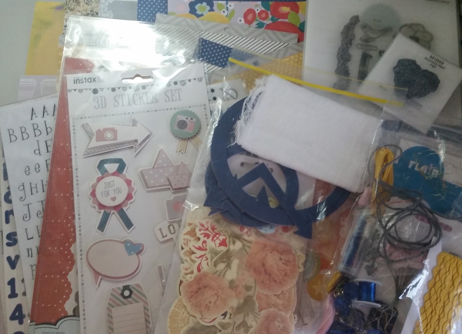 Some flowers, flairs, project life cards & papers, embroidery thread, twine, beading wire, ricrac, resin flowers, charms, glass sprinkles and broken necklace.